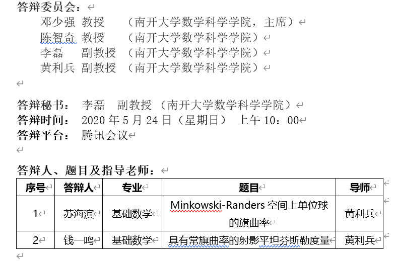 数学科学学院 硕士研究生(苏海滨、钱一鸣)毕业论文 线上答辩公告