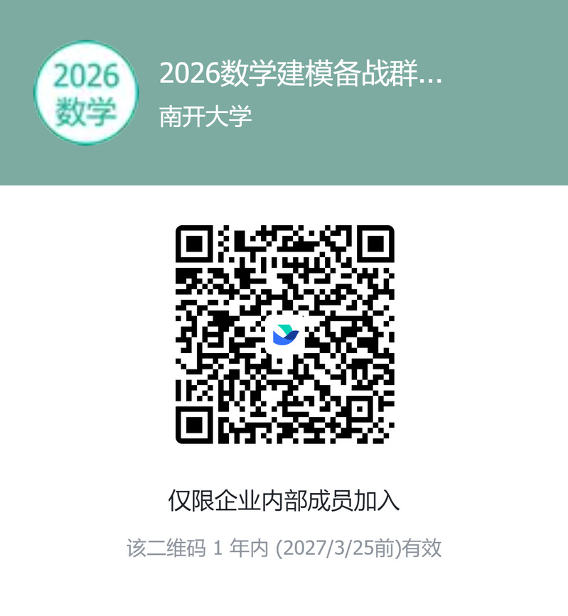 为备战2026年全国大学生数学建赛竞赛及南开大学数学建模竞赛(兼选拔赛),现开始竞赛报名工作,组建2026年南开大学建模飞书交流群,同学们可以进入飞书交流群进行组队、沟通等工作。