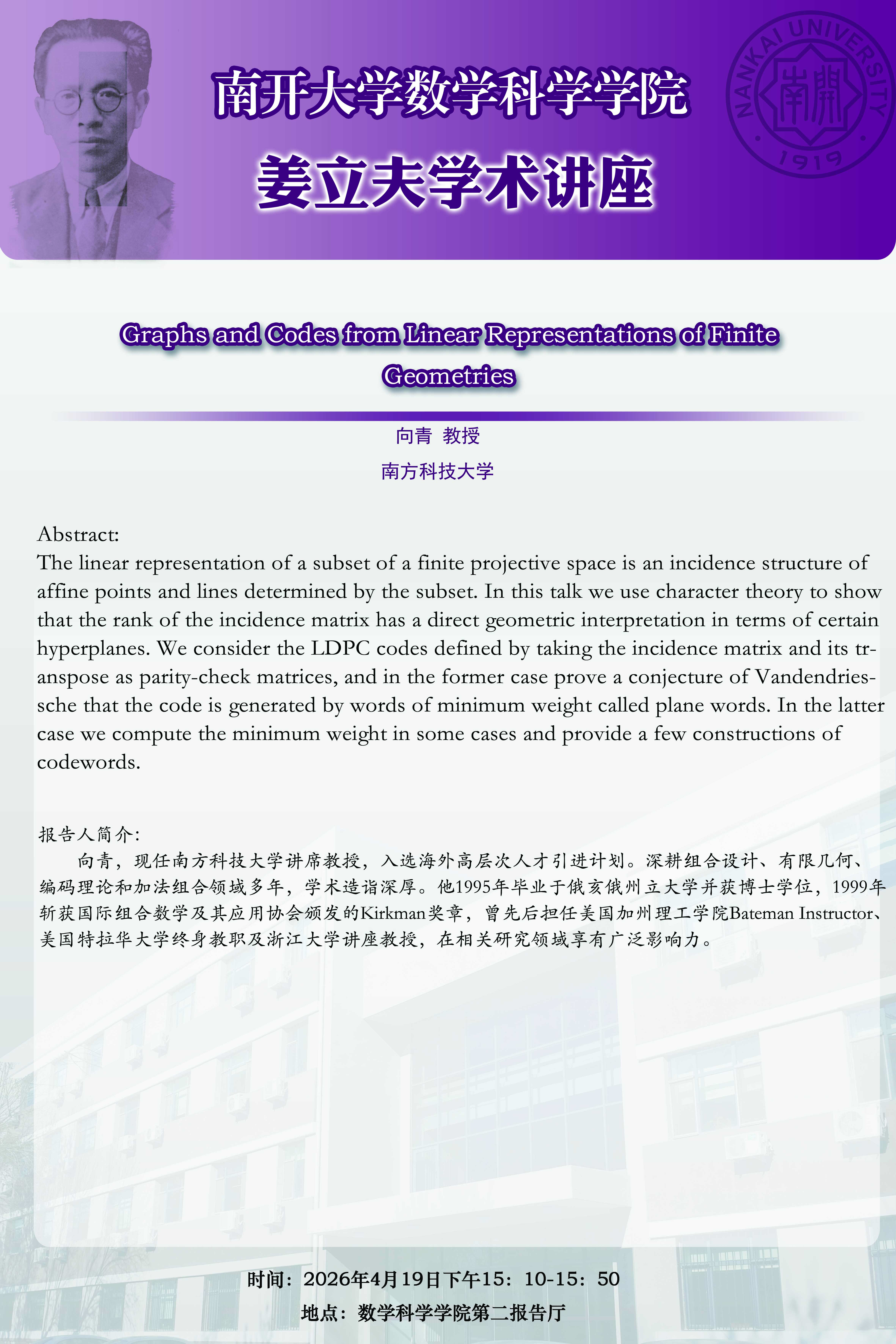 【姜立夫学术讲座】Graphs and Codes from Linear Representations of Finite Geometries